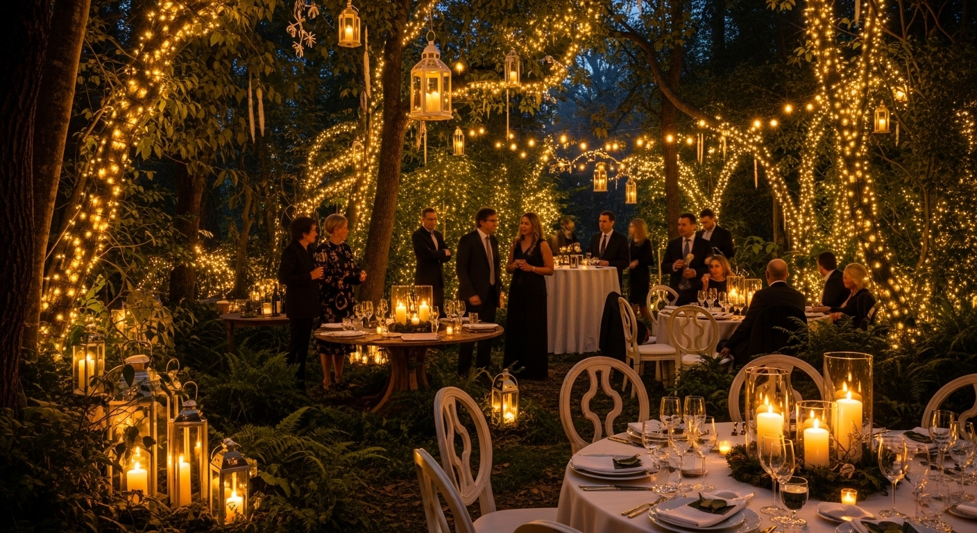 Transporta a tus invitados a un reino boscoso caprichoso. Usa acentos de musgo, hiedra arrastrante, luces centelleantes suaves y linternas delicadas para evocar un bosque místico. Considera colgar orbes de vidrio, ramas de imitación y sutiles efectos de niebla para profundizar el encanto.