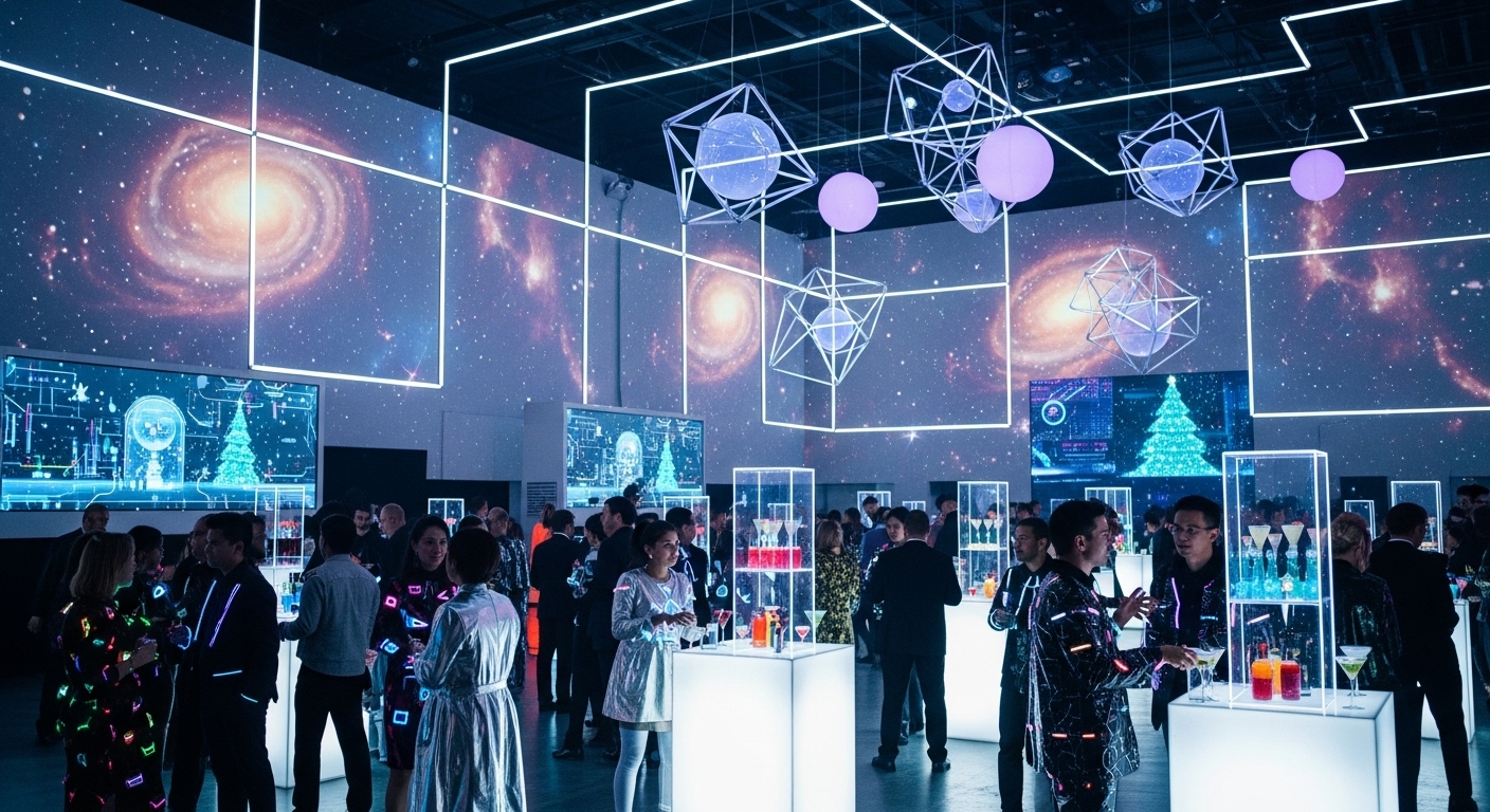 Adéntrate en el mañana con una atmósfera elegante y tecnológica. Paredes LED, proyecciones holográficas, acabados metálicos, iluminación láser e instalaciones digitales interactivas definen este audaz tema de eventos corporativos.