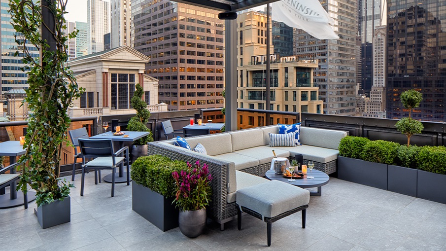 A: The Peninsula New York features the “Pen Top” rooftop terrace with iconic skyline views.